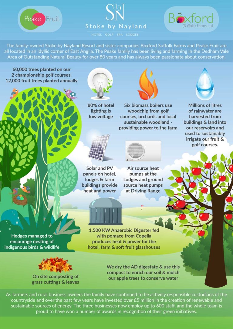 Since 2012 the business has invested over £5 million in the creation of renewable and sustainable sources of energy. The major investment has been in a 1.5-megawatt anaerobic digestion biogas plant which uses pomace from the Copella factory, maize and fruit bi products from the farm to produce a biogas which is converted to provide green electricity and heat to Stoke by Nayland Hotel, Boxford Farms and the Copella juice plant.